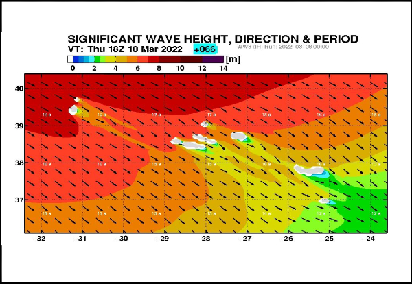 A agitação marítima será caracterizada por uma ondulação proveniente do quadrante Noroeste, com uma altura significativa que poderá atingir os oito metros e uma altura máxima de 12 metros, com um período médio a variar entre os 13 e os 19 segundos. São esperados ventos com uma intensidade média de até 60km/h e rajadas até 90km/h, provenientes do quadrante Oeste/Noroeste.