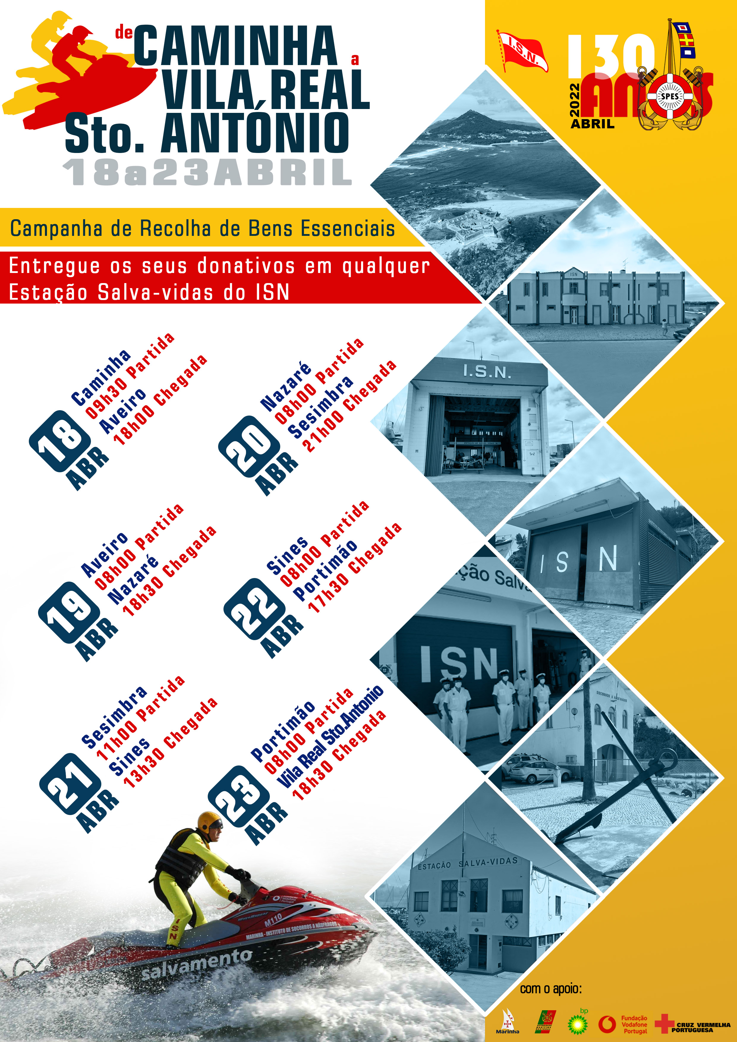 ​Esta campanha, marcada pela realização de um trajeto de duas motas de salvamento marítimo do Instituto de Socorros a Náufragos, que partem de Caminha com destino a Vila Real de Santo António, percorrendo toda a costa portuguesa de 18 a 23 de abril, tem como objetivo a recolha de bens essenciais que serão posteriormente entregues à Cruz Vermelha Portuguesa.