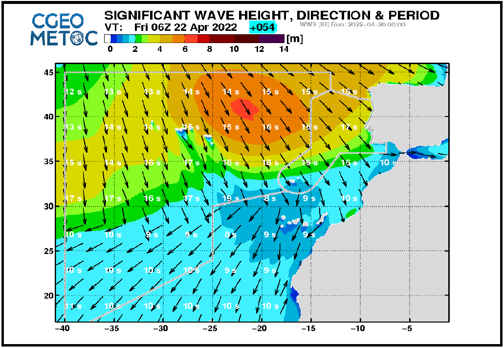 A agitação marítima será caracterizada por uma ondulação proveniente do quadrante Noroeste, com uma altura significativa que poderá atingir os sete metros e uma altura máxima de 13 metros, com um período médio a variar entre os 12 e os 16 segundos. São esperados ventos com uma intensidade média de até 65km/h e rajadas até 115km/h, provenientes do quadrante Noroeste.