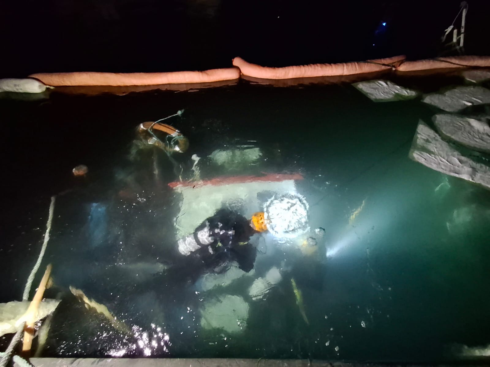À chegada ao local, constatou-se que a embarcação já estava no fundo e que apresentava um pequeno foco de poluição. Os elementos da Capitania do Porto colocaram uma barreira flutuante à volta da embarcação, de forma a garantir a contenção de material poluente, e recolheram o combustível com recurso a uma manta absorvente. Os elementos do GMF-OPS realizaram manobras subaquáticas de controlo do foco de poluição e de inspeção à embarcação, não tendo sido detetados danos no casco.
