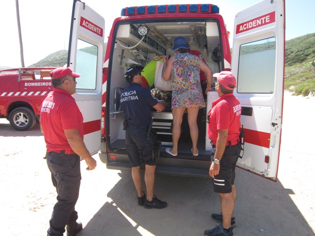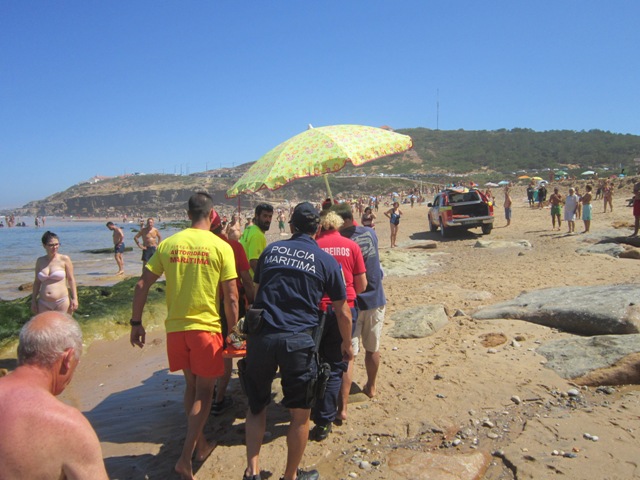 O piquete do Comando-local da Polícia Marítima de Cascais deslocou-se ontem, dia 6 de agosto, pelas 11h30, à praia de São Julião – Sintra, a fim de tomar conta de ocorrência e prestar auxílio a uma senhora de 70 anos de idade, vítima de queda, quando se deslocava a pé com familiares, durante a baixa-mar, pela zona rochosa, tendo escorregado numa rocha e caído, sofrendo várias lesões ao nível lombar, coxis e crânio.