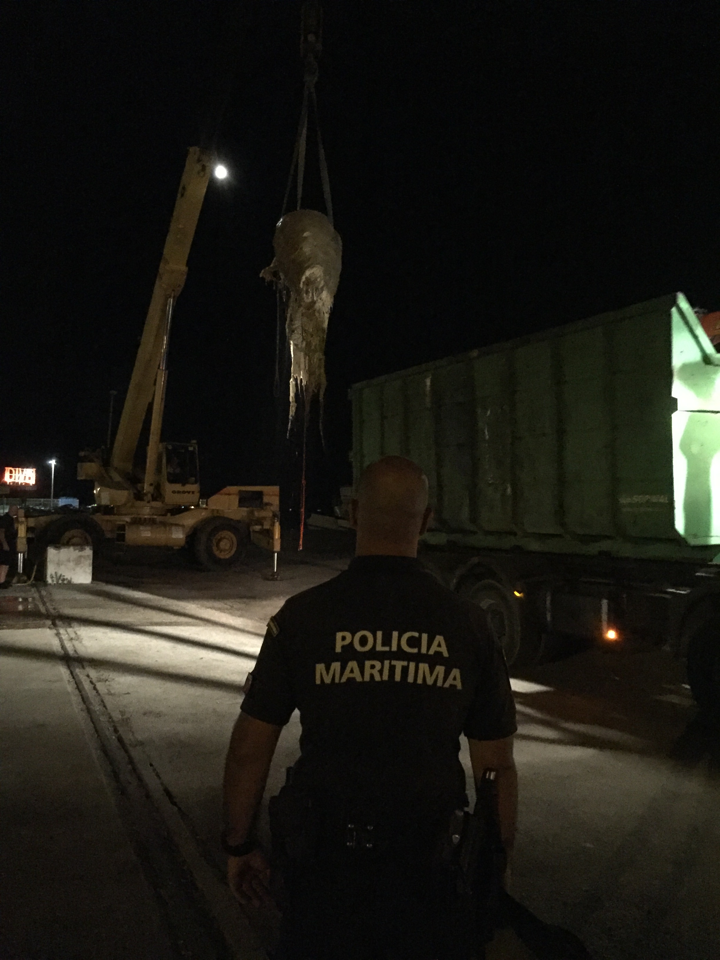 A baleia foi rebocada da praia da Armona Mar, entre bancos de areia e com Sueste, até ao porto de Olhão, onde foi recolhida por uma grua. O percurso com cerca de 6km demorou 2 horas a realizar. A carcaça pesava cerca de 3 toneladas e media mais de 7 metros de comprimento.