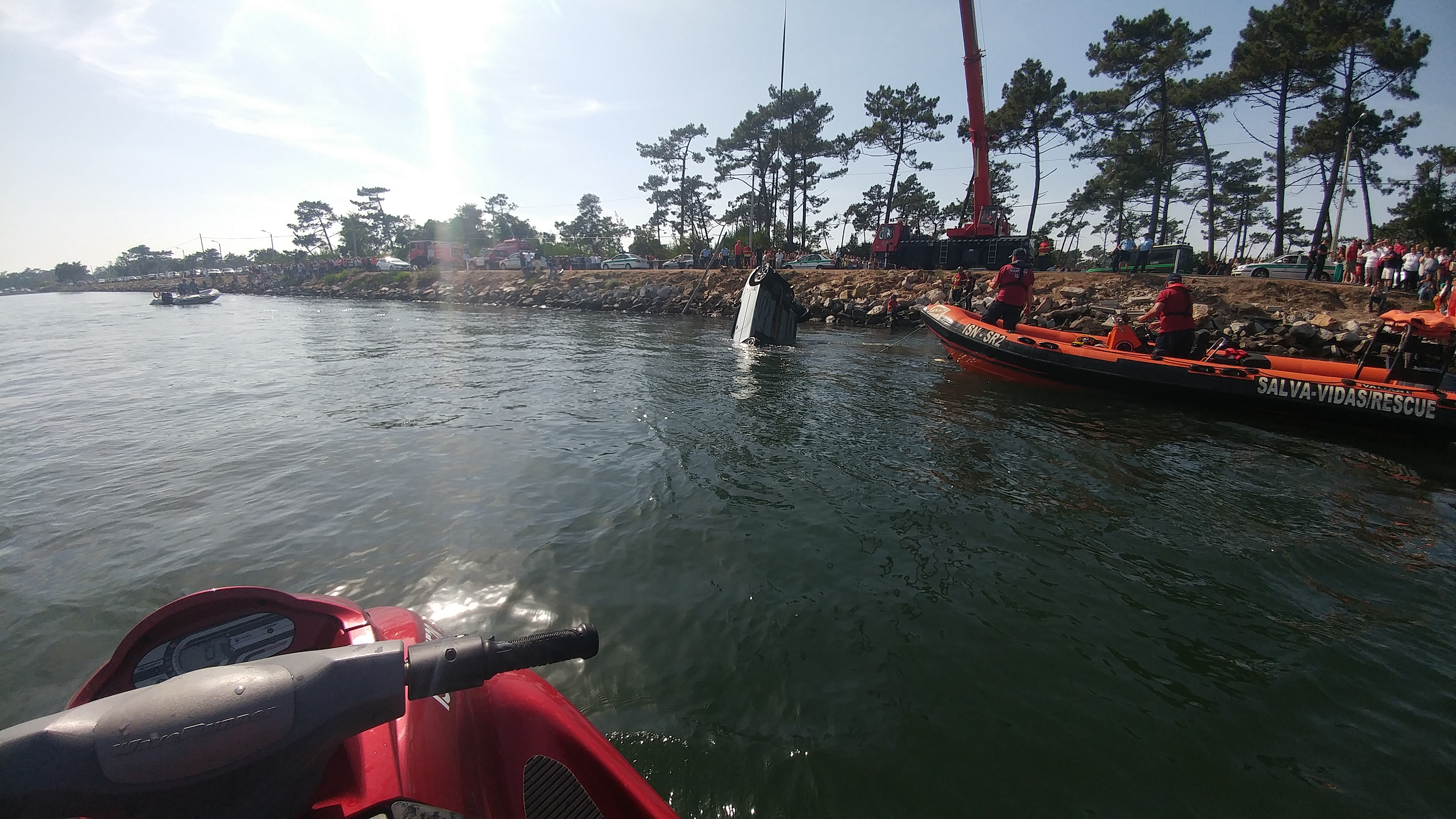 O alerta foi recebido pelas 14h21 através de contactos telefónicos do CDOS-Aveiro e da GNR-Murtosa, de que havia caído à ria de Aveiro, na estrada EN-327, entre as localidades de São Jacinto e da Torreira, uma viatura de passageiros ligeira, com duas pessoas no seu interior. De imediato, foram empenhadas o Salva-vidas “SR2” e uma moto de água de salvamento marítimo, ambas da Estação Salva-vidas do ISN de Aveiro, e duas embarcações do Comando-local da Polícia Marítima de Aveiro. Foi ainda solicitada a colaboração do Grupo de mergulhadores dos Bombeiros Voluntários Novos de Aveiro e ambulâncias dos Bombeiros Voluntários da Murtosa.